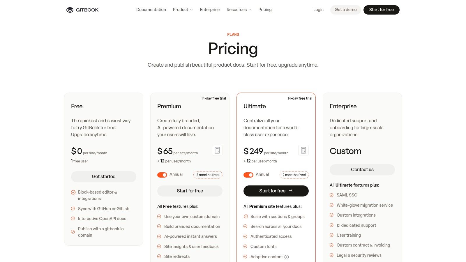 Team features, custom domains, and private documentation require paid plans.
