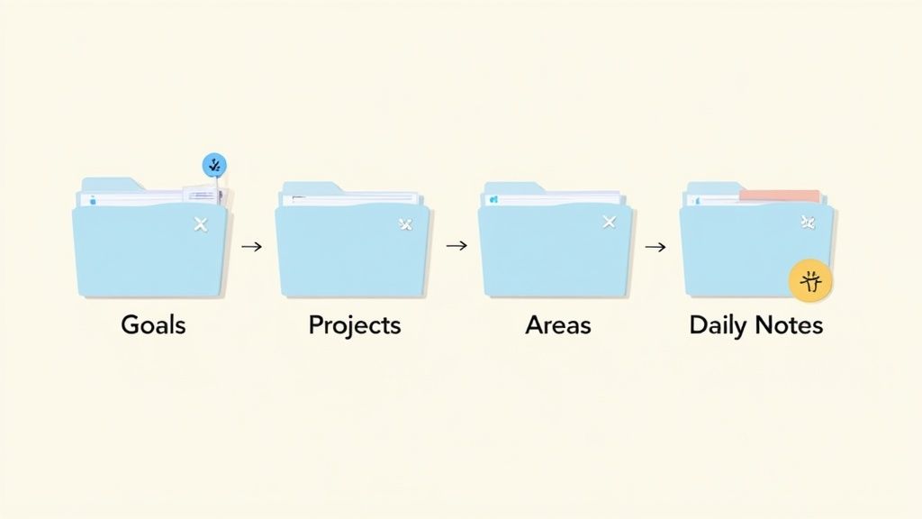 One of the biggest mistakes I see people make is creating folders on the fly. It feels productive at the moment, but it quickly leads to a messy, inconsistent vault that’s a nightmare to navigate. A much better approach is to adopt a system that’s built to scale with you.