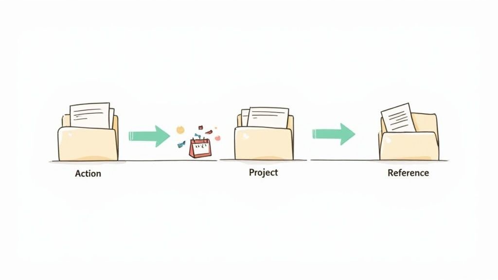 At its core, processing your notes is a simple triage exercise. For every single item in your inbox, you ask a straightforward question: "What is this, and where does it belong?" Most of your notes will naturally fall into one of three buckets, a concept made popular by frameworks like P.A.R.A. (Projects, Areas, Resources, Archives).