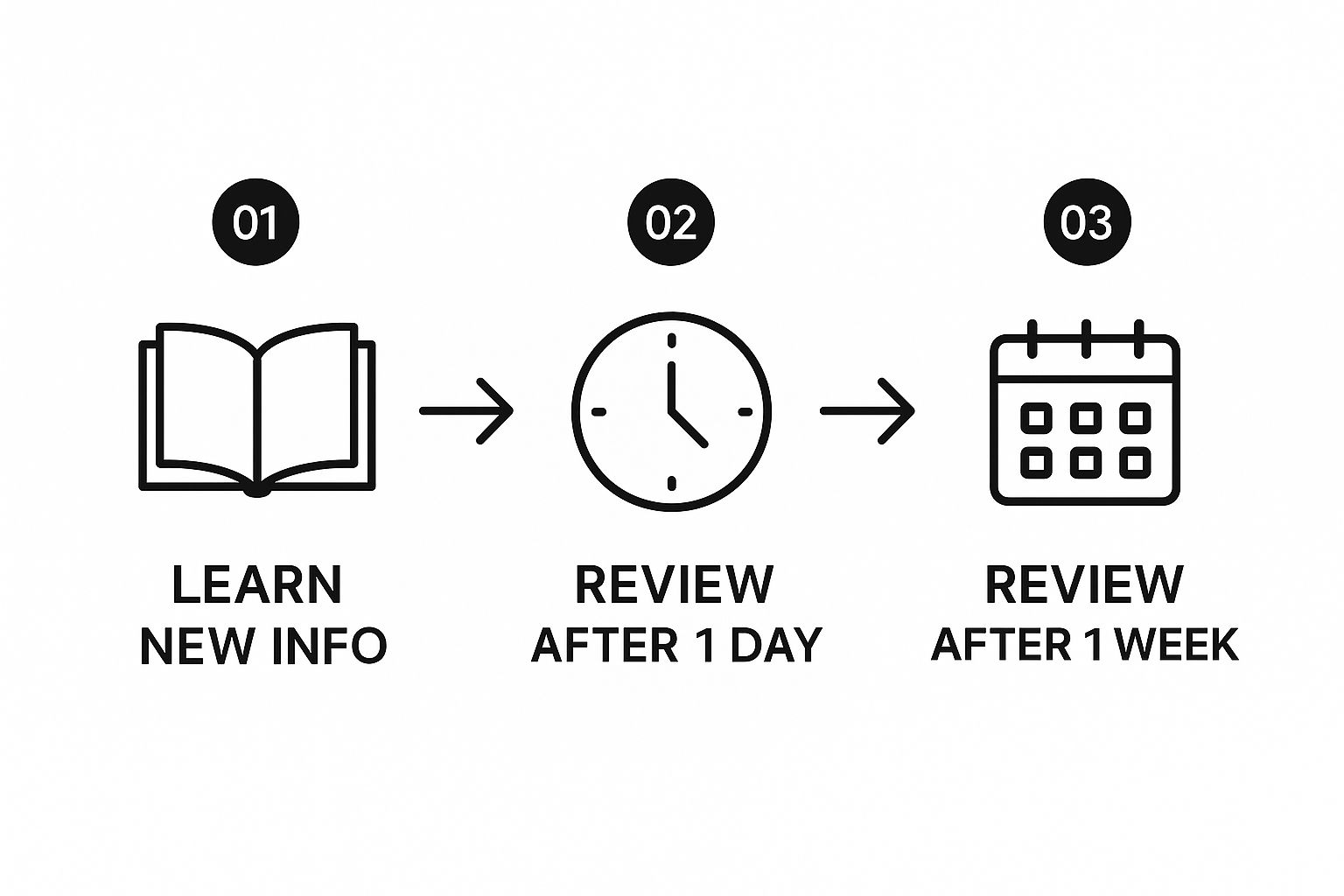 If active recall is how you forge strong memories, then spaced repetition is how you keep them from rusting over time. It's a surprisingly simple, yet powerful, system for reviewing what you've learned at strategic intervals. The whole idea is to interrupt the natural "Forgetting Curve" right before a memory completely fades away.