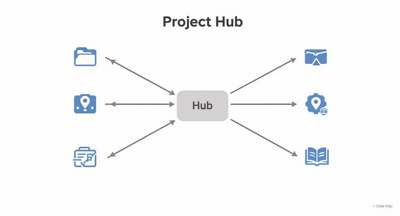 Inside this "Projects Hub" note, you’ll create links to each individual project as you spin them up. The hub basically becomes your index, making it dead simple to jump to any project's dedicated page without having to dig through folders. While Obsibrain is a fantastic, integrated system for this, if you're new to this world, it can be helpful to see how others approach dashboards by understanding other flexible productivity platforms like Notion.