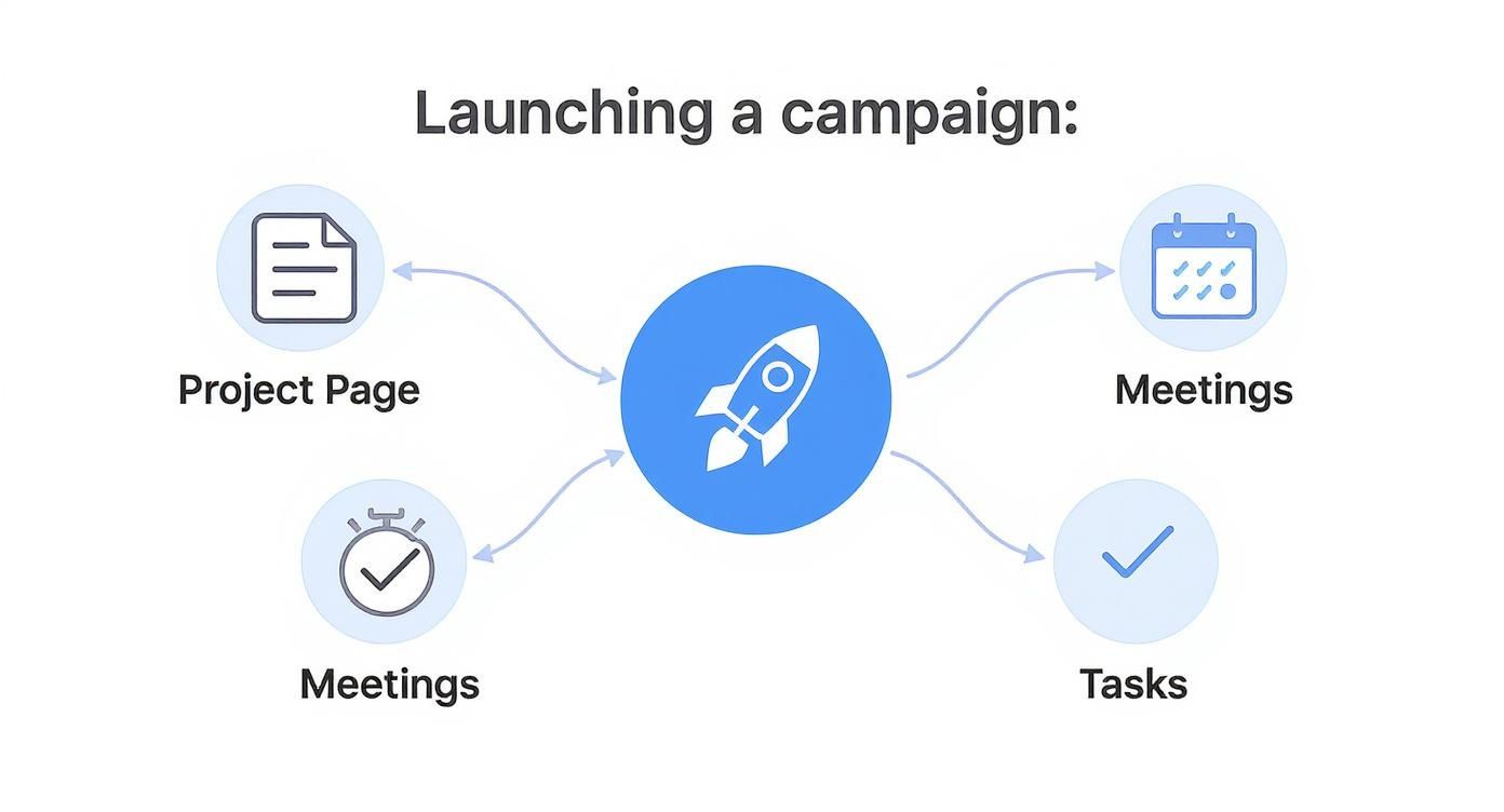 This whole concept is about creating a central hub for each project that connects all the moving parts—meetings, tasks, research—into one cohesive system.