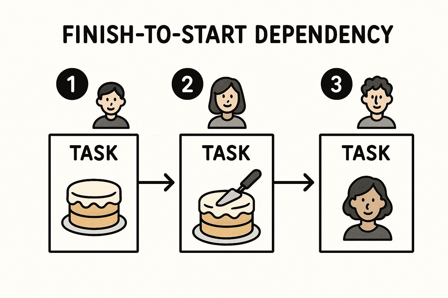 As you lay out these tasks, you'll immediately run into task dependencies. This is just a formal way of saying that some things have to happen before others can start. You can't frost a cake before you bake it, right? Same principle. The most common relationship you'll deal with is: