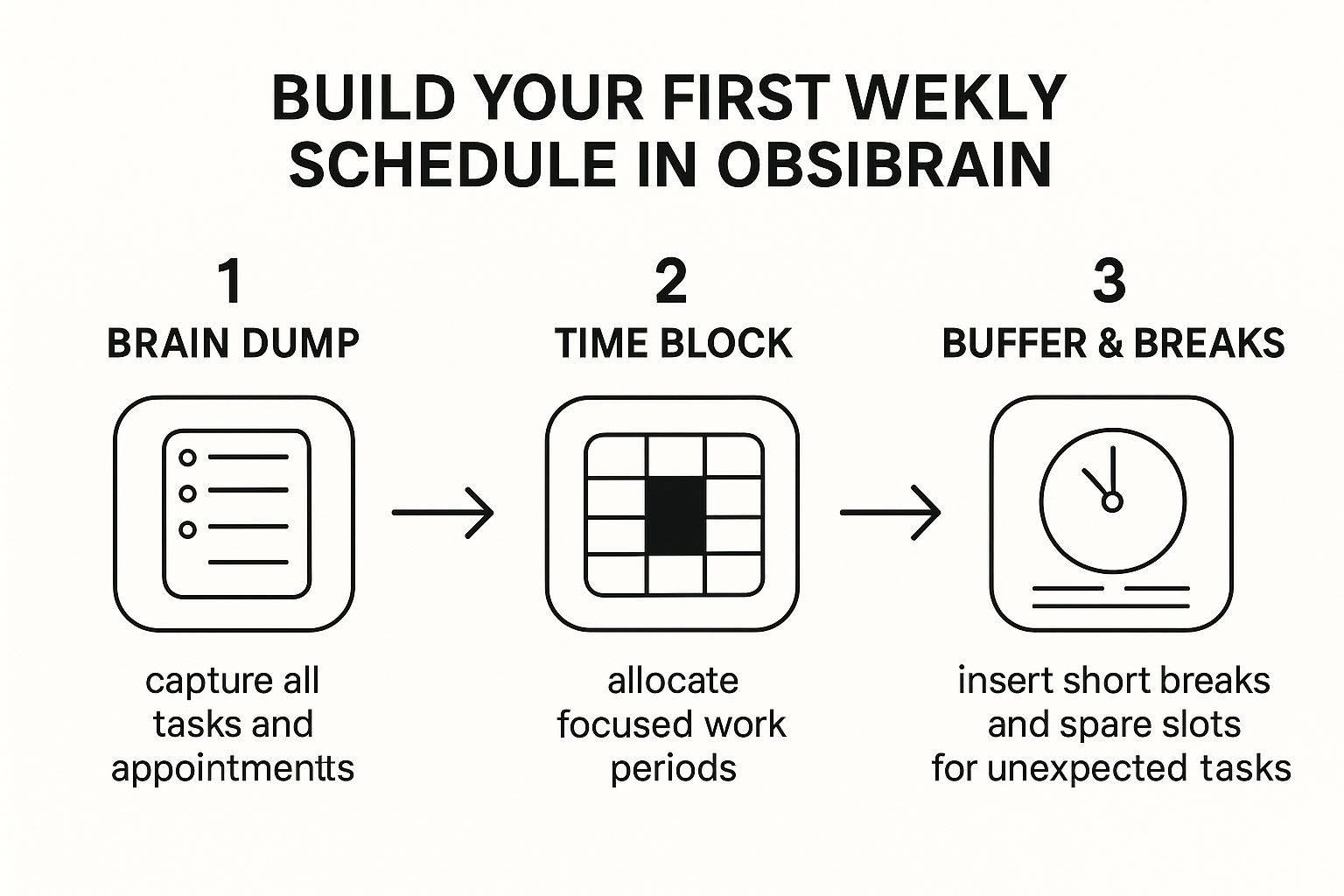 Once you’ve emptied your head, you'll start to see how Obsibrain is designed to handle this raw information. The template keeps things simple on purpose, so you won’t get lost clicking through a dozen features you don't need yet. You'll really only be working with a few key areas to get your first schedules built.