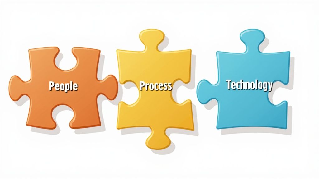 This visual drives home an important point: technology is just one piece of the puzzle. Without the right people and processes in place, even the fanciest system is doomed to fail. Let's dig into the four pillars that bring all of this together.